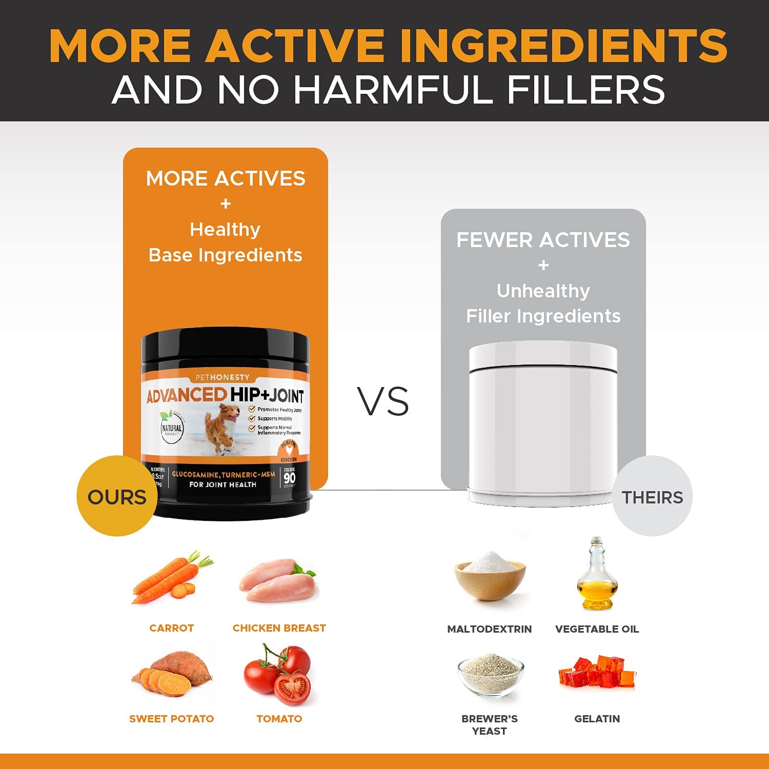 Higher Amounts Of Active Ingredients = Longer Lasting Supply – Our Advanced Hip + Joint chews have higher concentrations of active ingredients than other competitor brands. This means better results, a longer lasting supply of treats, and more bang for your buck.